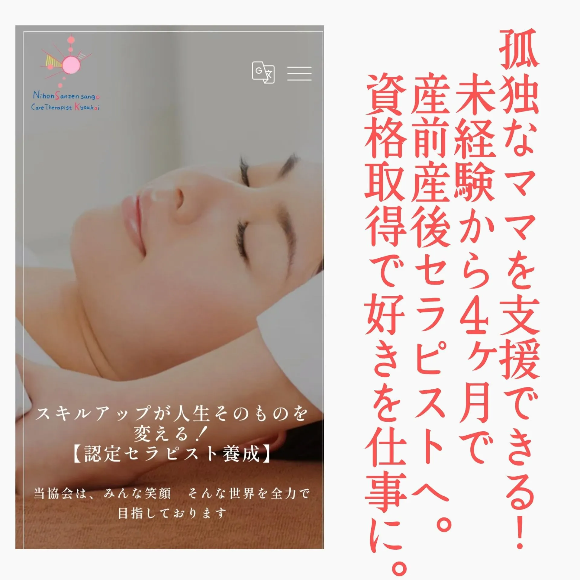 【孤独なママを支援できる/未経験から4ヶ月で産前産後ケア専門セラピストへ。/資格取得で好きを仕事に。】 未経験から4ヶ月で産前産後ケア専門セラピストへ。/資格取得で好きを仕事に。【孤独なママを支援できる/未経験から4ヶ月で産前産後セラピストへ。/資格取得で好きを仕事に。】 産後に孤独感を感じ、最終…
